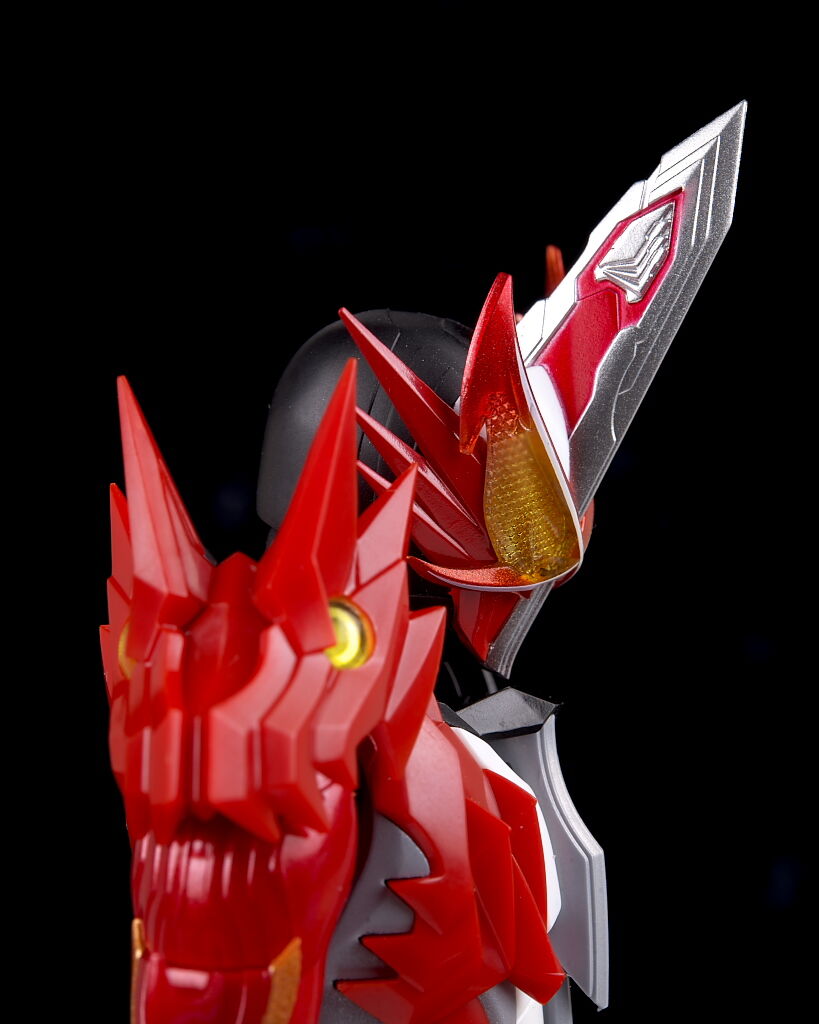 複眼はモールドで再現されてます。複眼の周りの炎や額のソードクラウンなどシャープな造形です。額の刃は赤と銀が正確に塗り分けられています。
