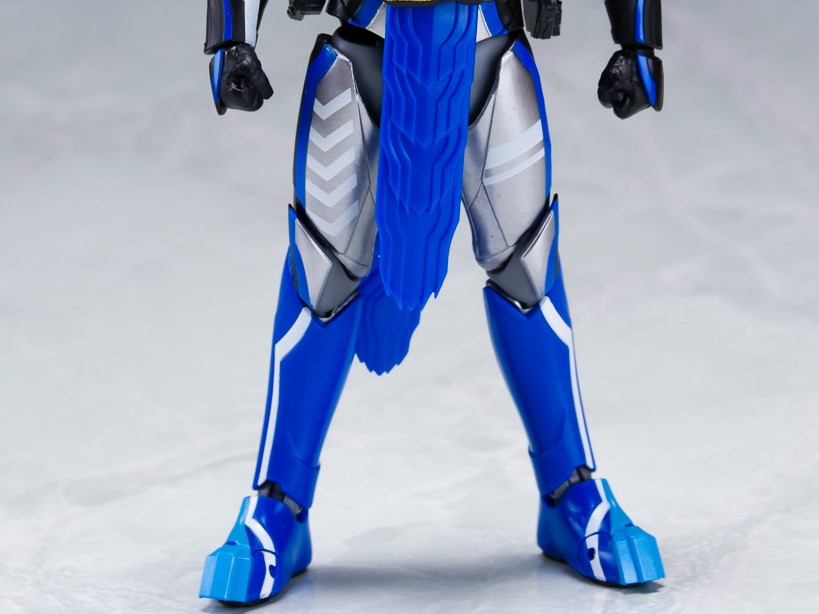 全身。素体はセイバーと共通で頭部や胴体、右腕、足首などが新規です。再現の高い青中心のカラーリングにアーマー姿、シャープな造形の水勢剣流水など劇中イメージに近いです。別売仮面ライダーセイバー用のベルト用聖剣、火炎剣烈火が付属されてます。