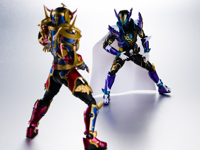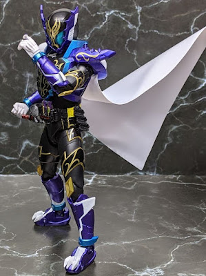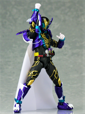 全身。頭部と足裏が新規造形で、紫の部分はローグ、黒い部分はビルドから流用です。メタリックのパープルや金色の模様が綺麗です。新造型のマントはビニール系で柔らかいのでアクションポーズに対応できます。